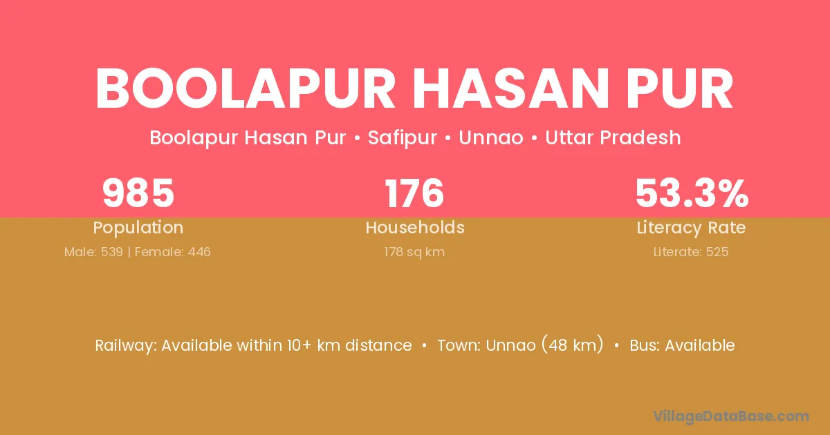 Boolapur Hasan Pur village has a total population of 985 people, of which 539 are males and 446 are females.