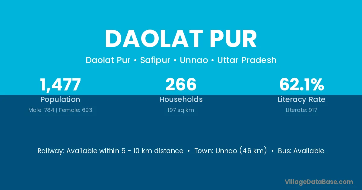 Unnao (46 km) is the nearest town to Daolat Pur village for major economic activities and is located approximately 46 km away.
