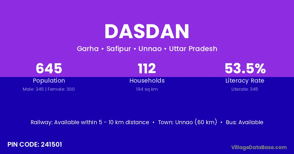 Unnao (60 km) is the nearest town to Dasdan village for major economic activities and is located approximately 60 km away.