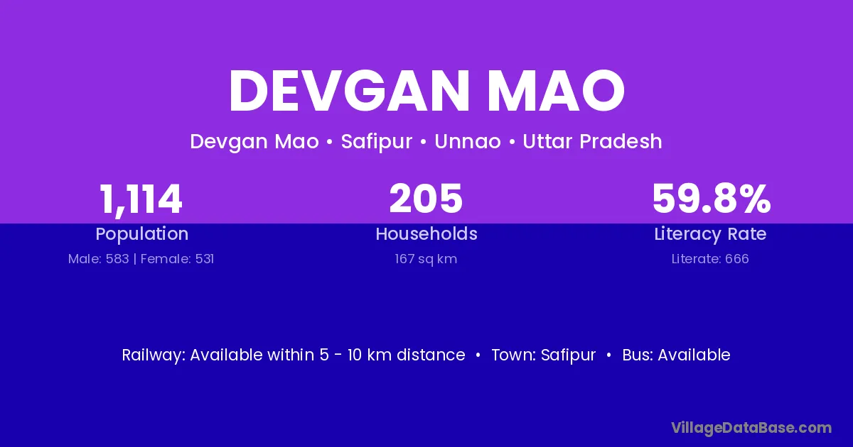 Devgan Mao village has a total population of 1,114 people, of which 583 are males and 531 are females.