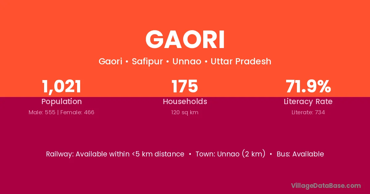 Unnao (2 km) is the nearest town to Gaori village for major economic activities and is located approximately 2 km away.