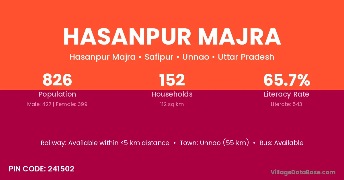 Unnao (55 km) is the nearest town to Hasanpur Majra village for major economic activities and is located approximately 55 km away.