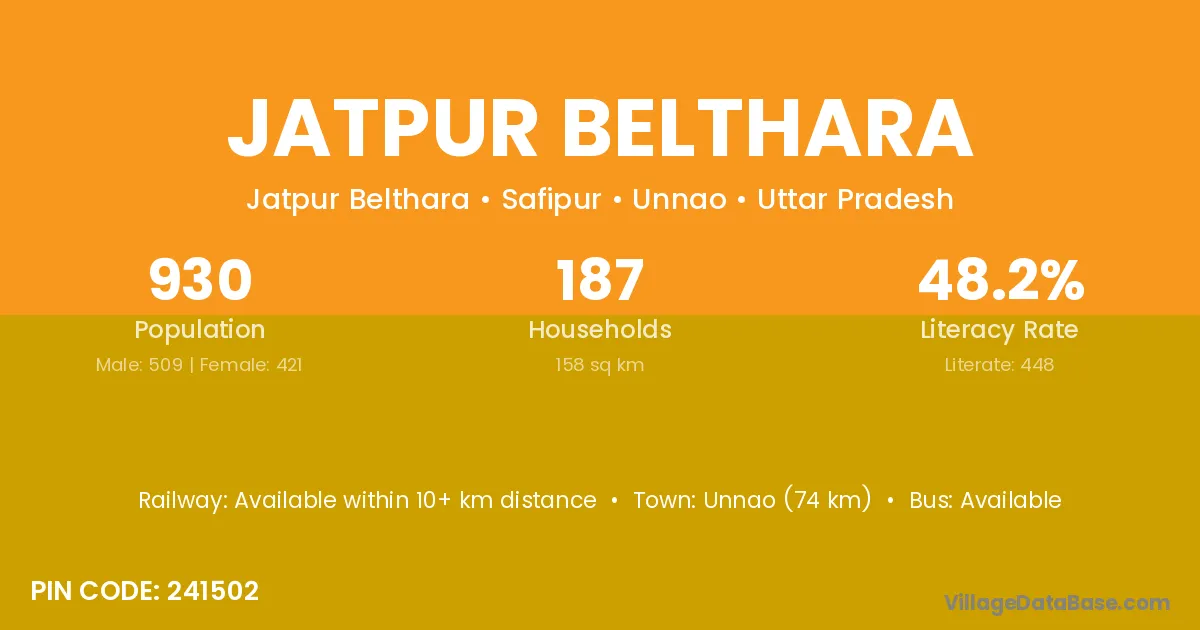 Unnao (74 km) is the nearest town to Jatpur Belthara village for major economic activities and is located approximately 74 km away.