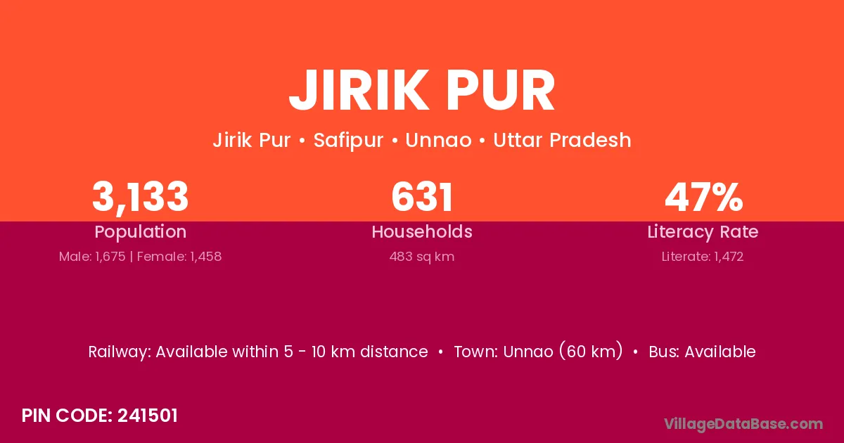 Unnao (60 km) is the nearest town to Jirik Pur village for major economic activities and is located approximately 60 km away.