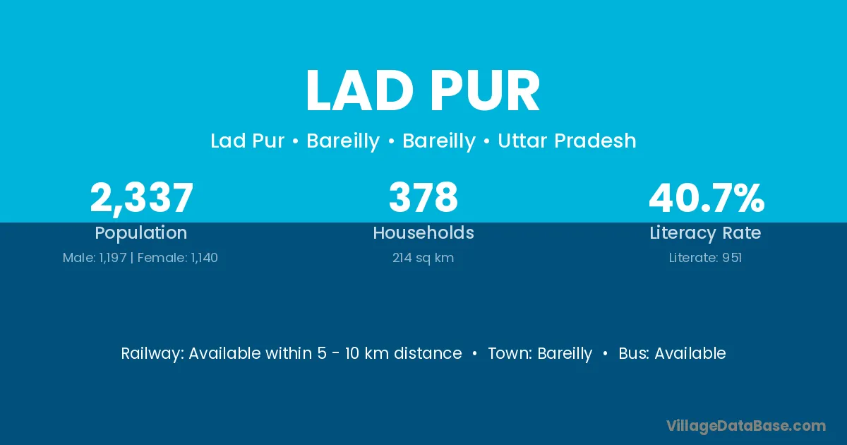 Unnao (67 km) is the nearest town to Lad Pur village for major economic activities and is located approximately 67 km away.