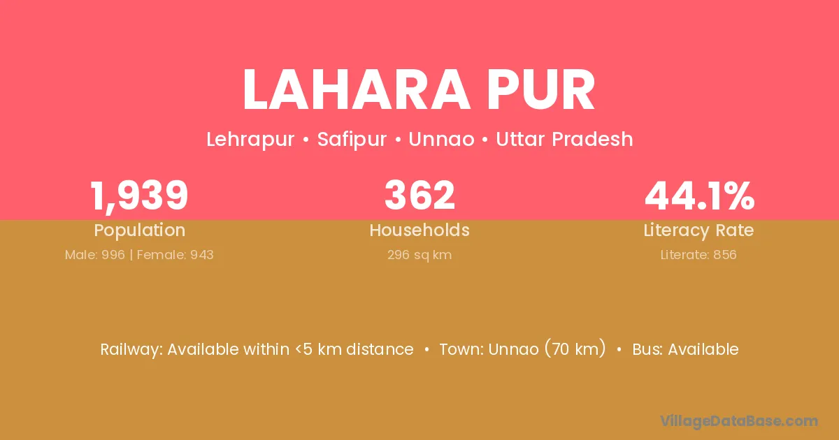 Unnao (70 km) is the nearest town to Lahara Pur village for major economic activities and is located approximately 70 km away.