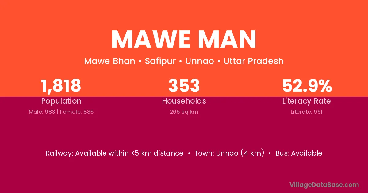 Unnao (4 km) is the nearest town to Mawe Man village for major economic activities and is located approximately 4 km away.