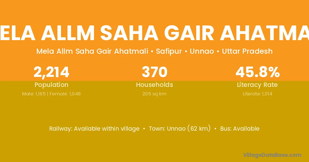 Unnao (62 km) is the nearest town to Mela Allm Saha Gair Ahatmali village for major economic activities and is located approximately 62 km away.