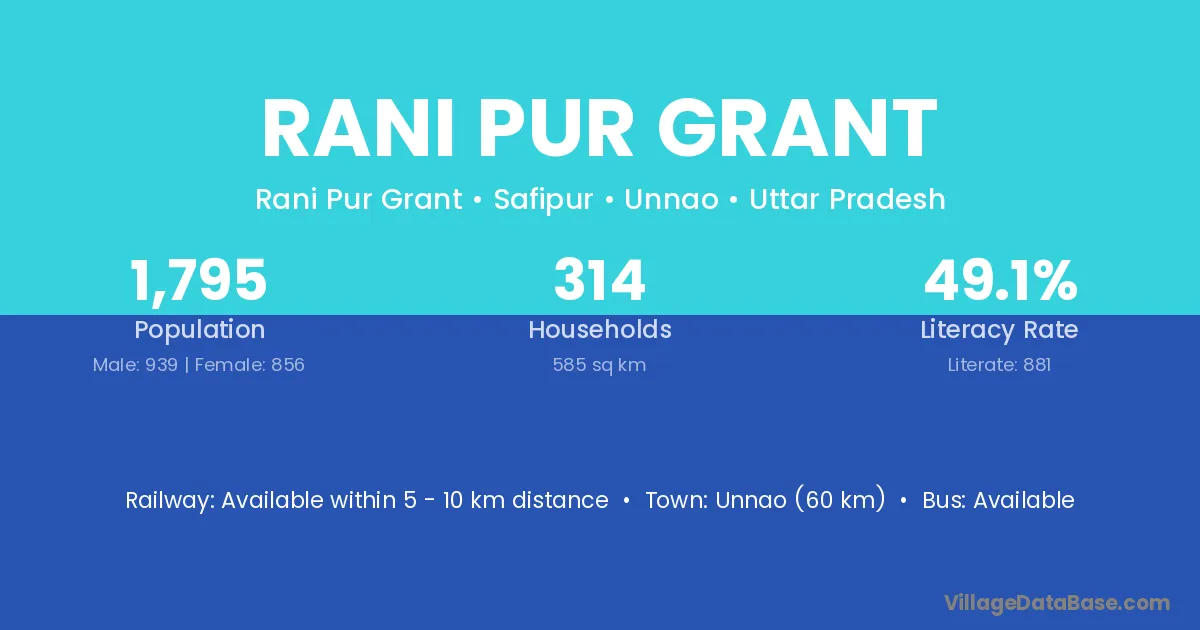Unnao (60 km) is the nearest town to Rani Pur Grant village for major economic activities and is located approximately 60 km away.