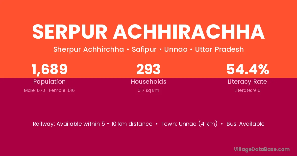 Serpur Achhirachha village has a total population of 1,689 people, of which 873 are males and 816 are females.