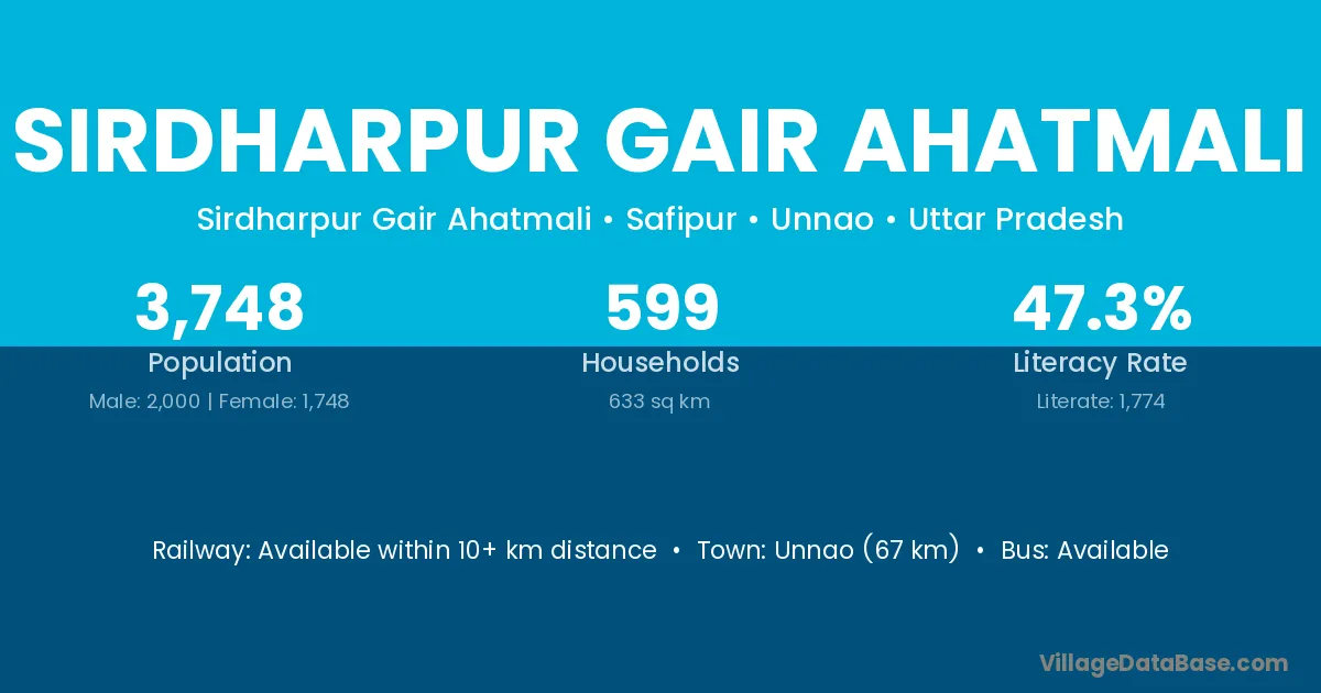 Unnao (67 km) is the nearest town to Sirdharpur Gair Ahatmali village for major economic activities and is located approximately 67 km away.