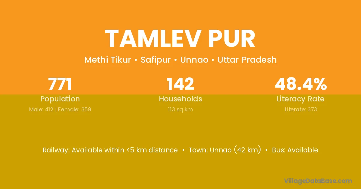 Unnao (42 km) is the nearest town to Tamlev Pur village for major economic activities and is located approximately 42 km away.
