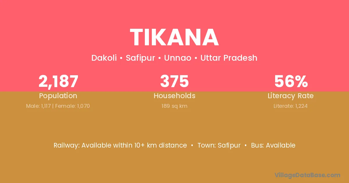 Tikana village has a total population of 2,187 people, of which 1,117 are males and 1,070 are females.