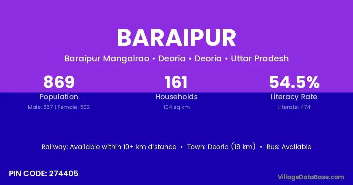 Baraipur village has a total population of 412 people, of which 208 are males and 204 are females.