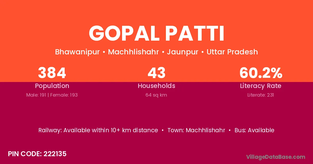 Varanasi (26 km) is the nearest town to Gopal Patti village for major economic activities and is located approximately 26 km away.