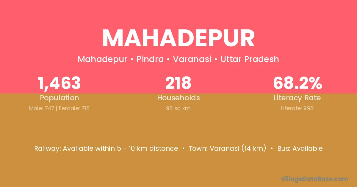 Varanasi (14 km) is the nearest town to Mahadepur village for major economic activities and is located approximately 14 km away.