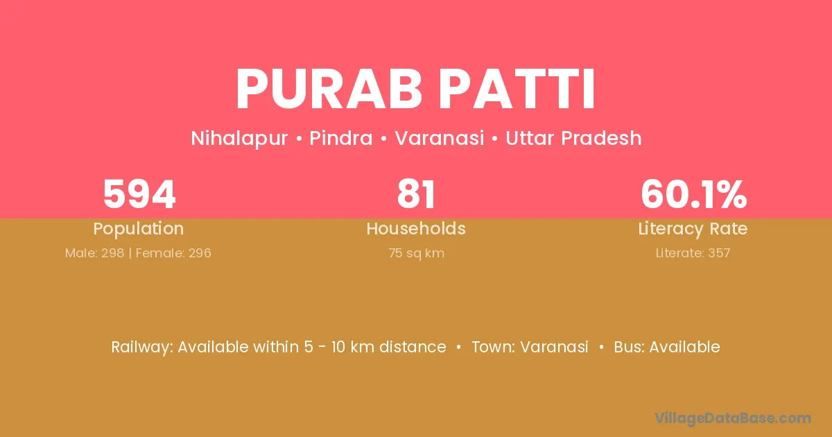 Purab Patti village has a total population of 594 people, of which 298 are males and 296 are females.