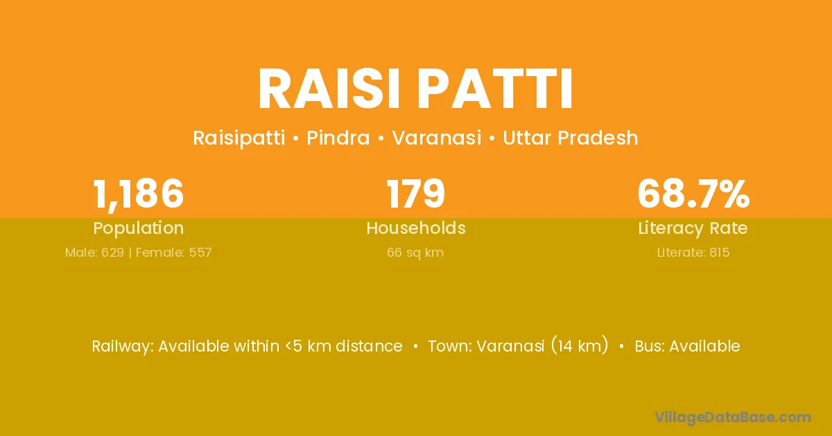 Varanasi (14 km) is the nearest town to Raisi Patti village for major economic activities and is located approximately 14 km away.