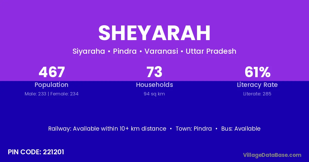 Sheyarah village is located in the Pindra Tehsil of the Varanasi district in Uttar Pradesh .