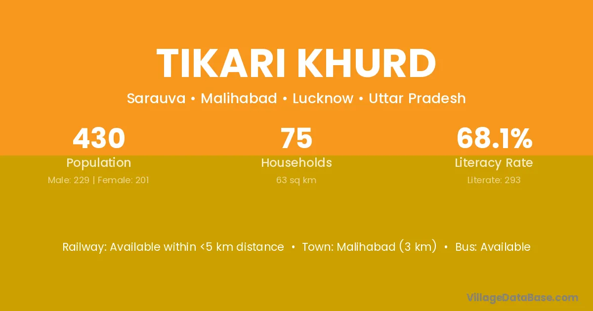 The literacy rate of Tikari Khurd village is 59.70%. Male literacy stands at 72.80% and female literacy at 47.55%.