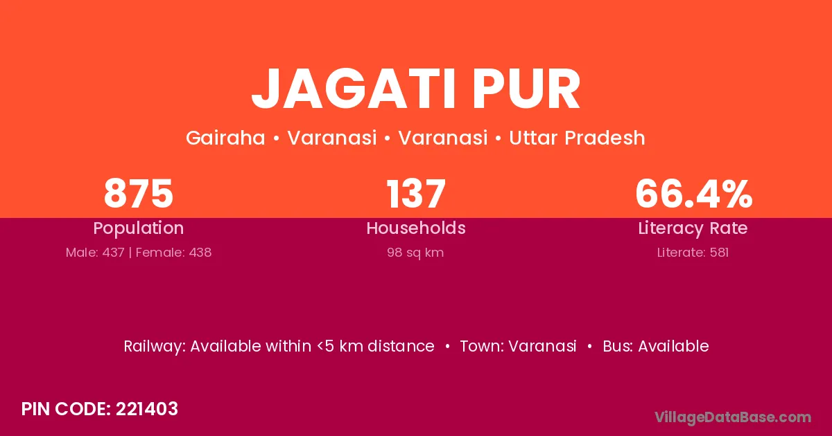 Jagati Pur village has a total population of 875 people, of which 437 are males and 438 are females.