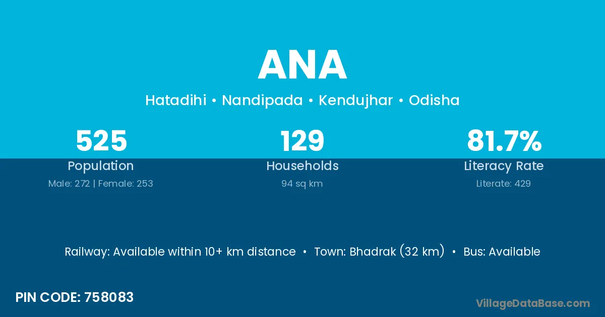 The literacy rate of Ana village is 70.66%. Male literacy stands at 79.09% and female literacy at 63.16%.