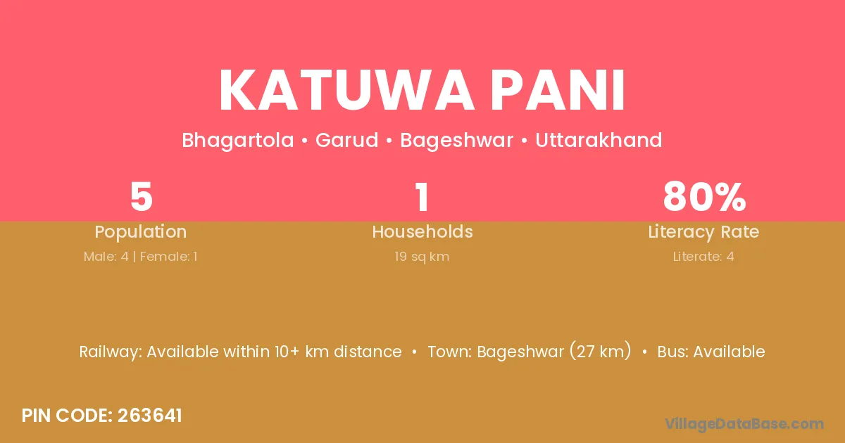 Bageshwar (27 km) is the nearest town to Katuwa Pani village for major economic activities and is located approximately 27 km away.