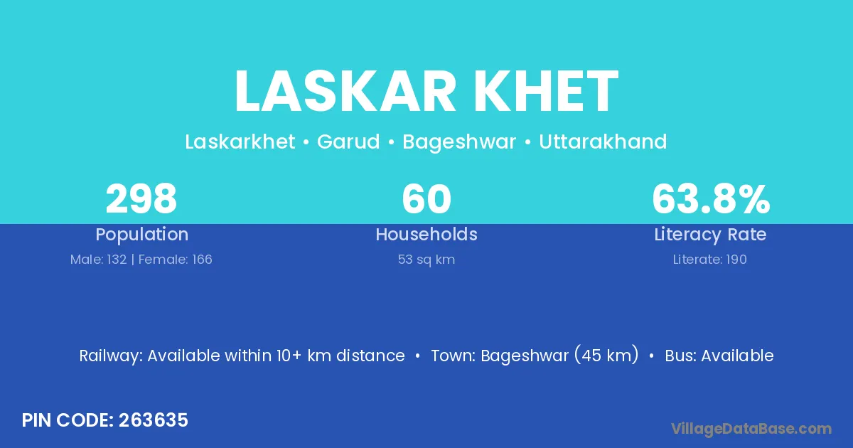 Bageshwar (45 km) is the nearest town to Laskar Khet village for major economic activities and is located approximately 45 km away.