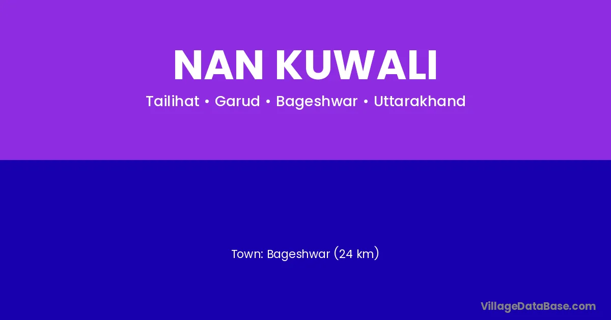 Bageshwar (24 km) is the nearest town to Nan Kuwali village for major economic activities and is located approximately 24 km away.