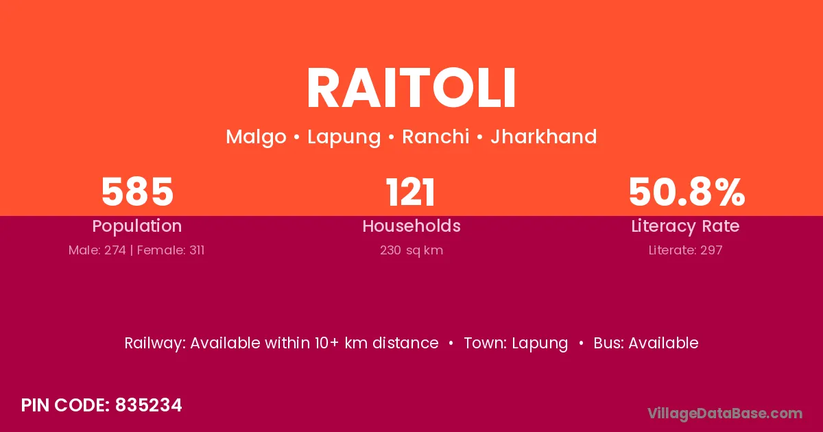 The literacy rate of Raitoli village is 73.77%. Male literacy stands at 83.95% and female literacy at 65.69%.
