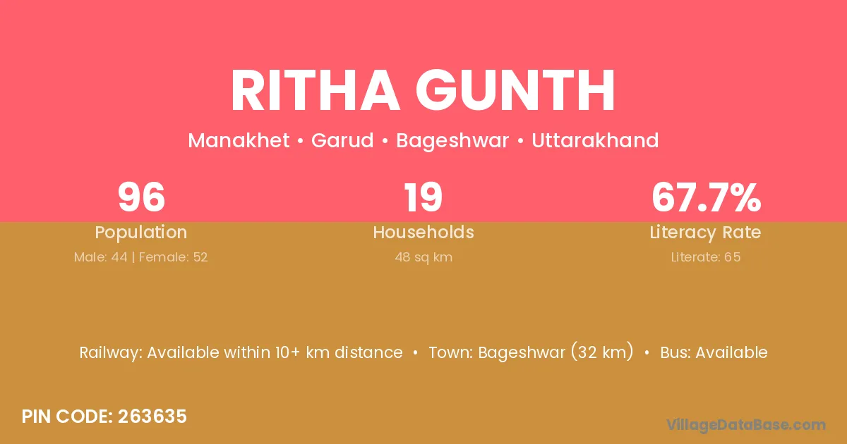 Bageshwar (32 km) is the nearest town to Ritha Gunth village for major economic activities and is located approximately 32 km away.