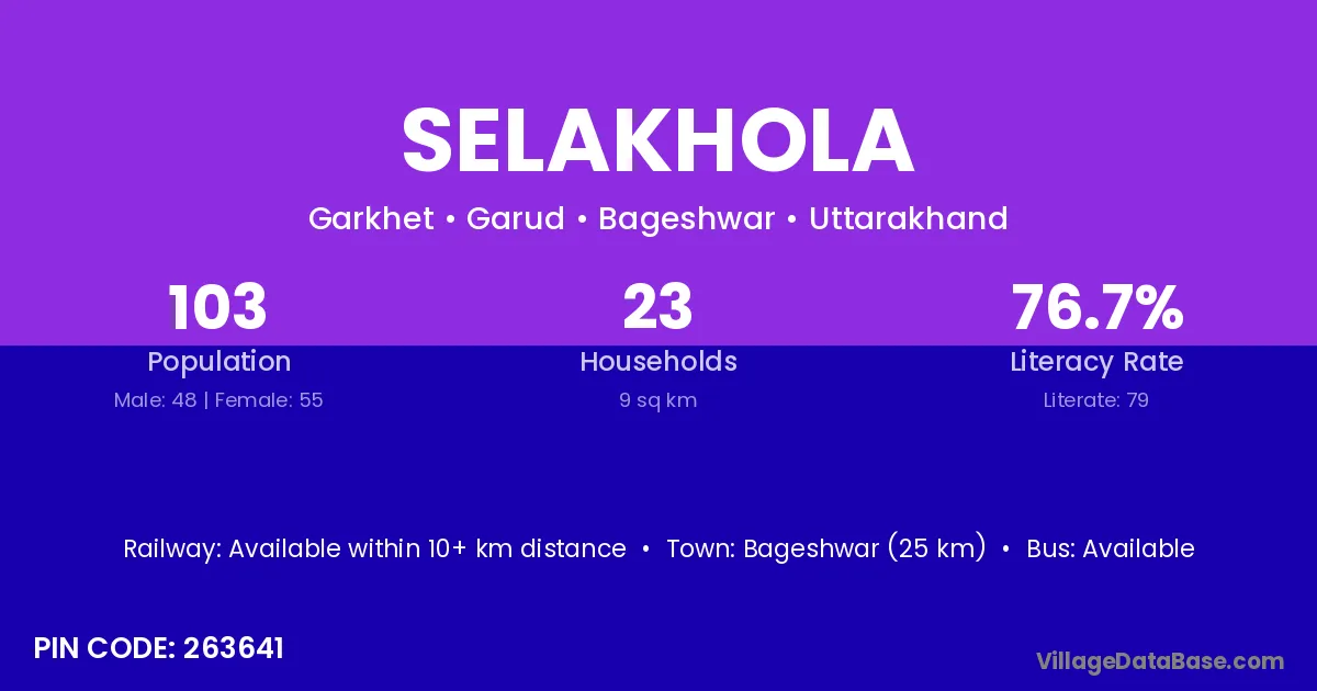 Bageshwar (25 km) is the nearest town to Selakhola village for major economic activities and is located approximately 25 km away.