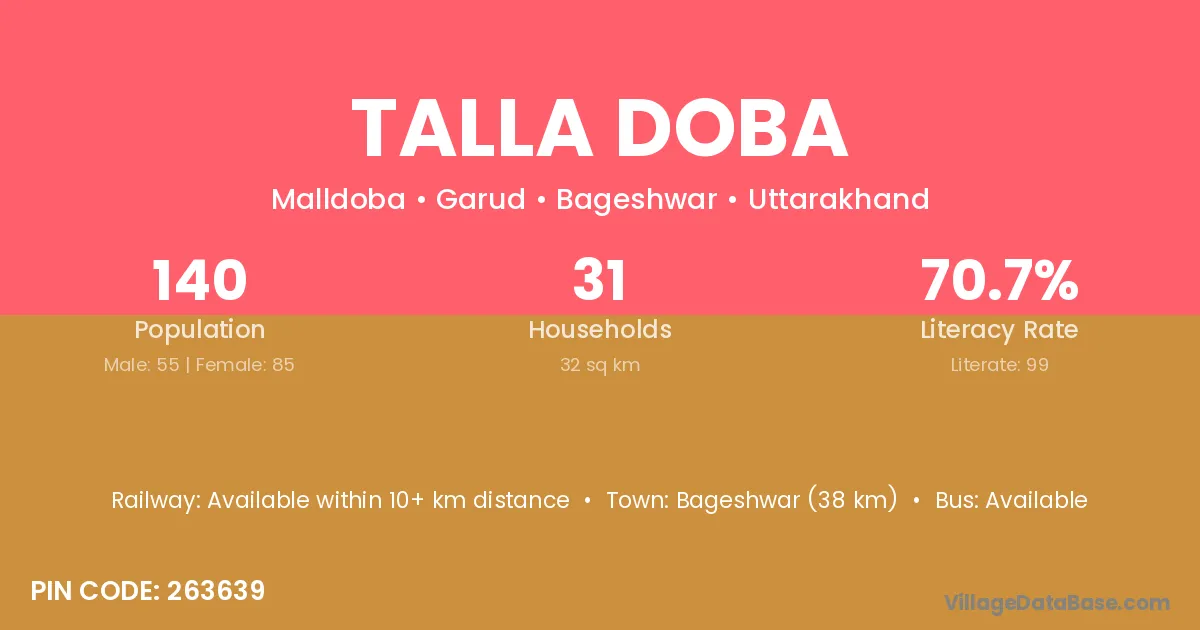 Bageshwar (38 km) is the nearest town to Talla Doba village for major economic activities and is located approximately 38 km away.