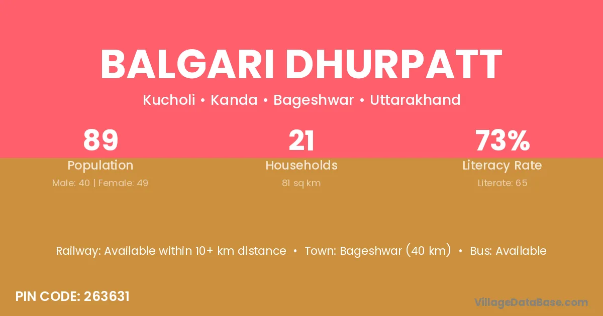 Balgari Dhurpatt village has a total population of 89 people, of which 40 are males and 49 are females.