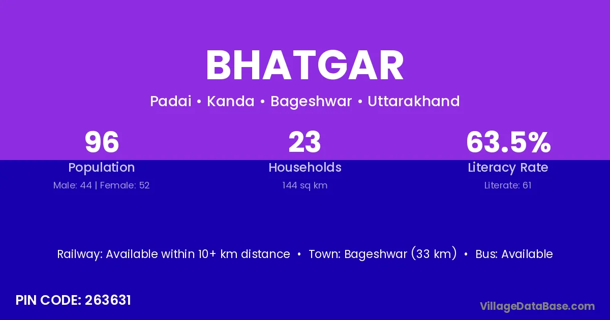 Bageshwar (33 km) is the nearest town to Bhatgar village for major economic activities and is located approximately 33 km away.