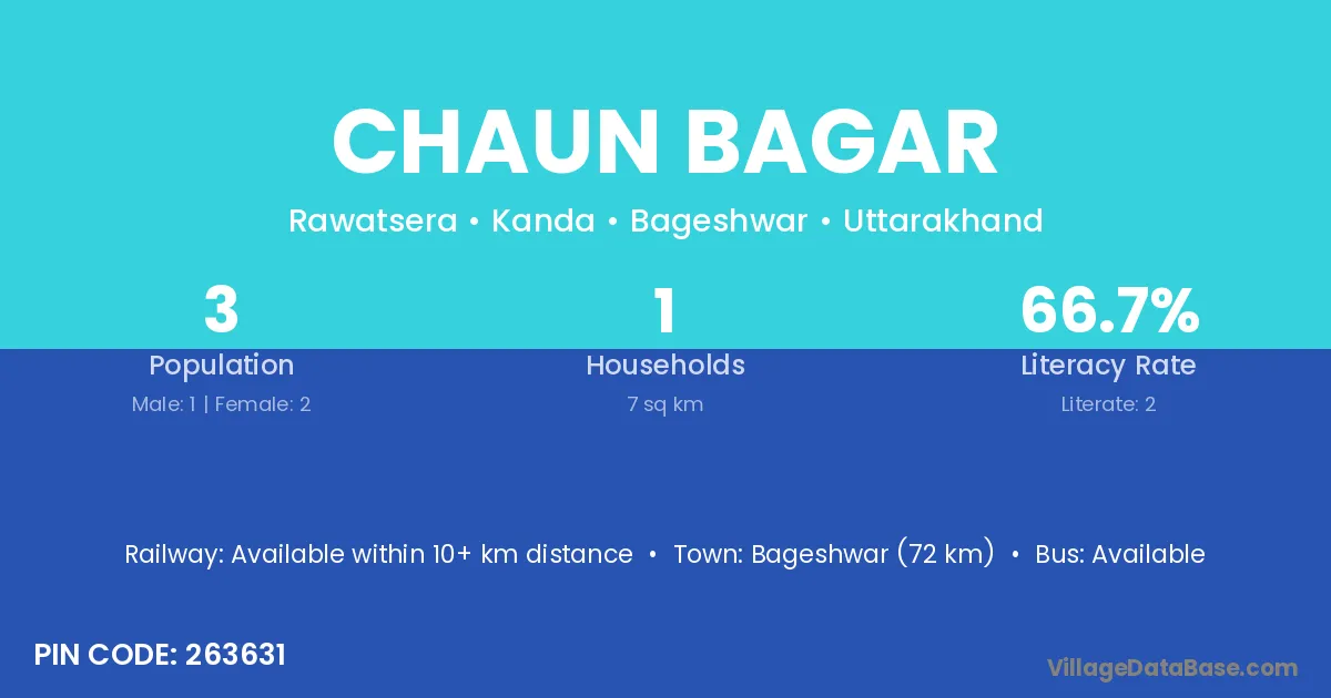 Bageshwar (72 km) is the nearest town to Chaun Bagar village for major economic activities and is located approximately 72 km away.