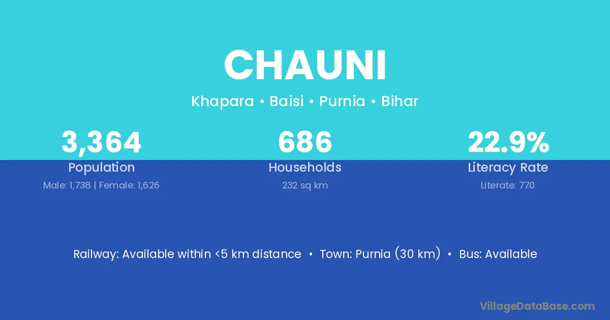 The literacy rate of Chauni village is 79.41%. Male literacy stands at 92.86% and female literacy at 70.00%.