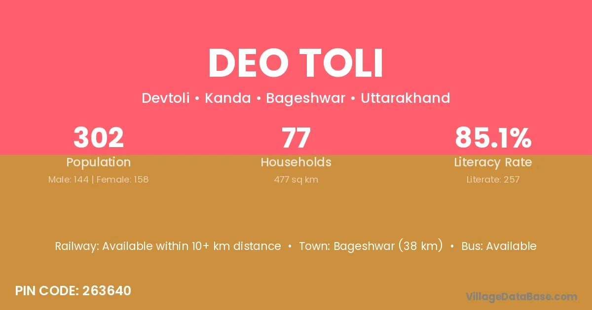 Bageshwar (38 km) is the nearest town to Deo Toli village for major economic activities and is located approximately 38 km away.