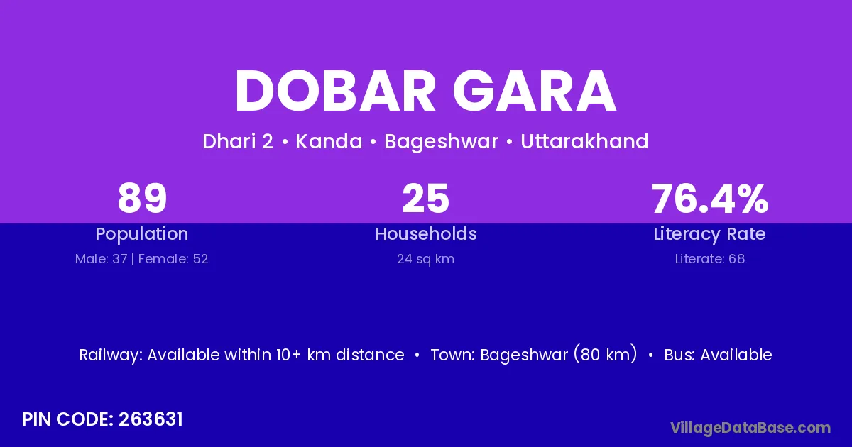 Bageshwar (80 km) is the nearest town to Dobar Gara village for major economic activities and is located approximately 80 km away.
