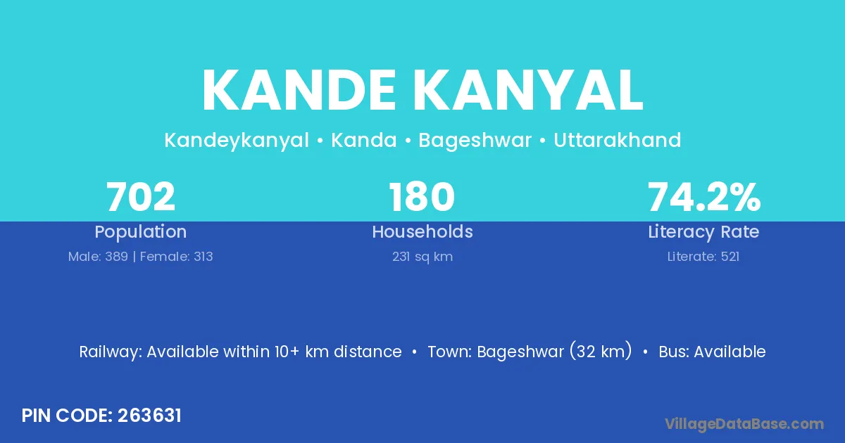 Bageshwar (32 km) is the nearest town to Kande Kanyal village for major economic activities and is located approximately 32 km away.