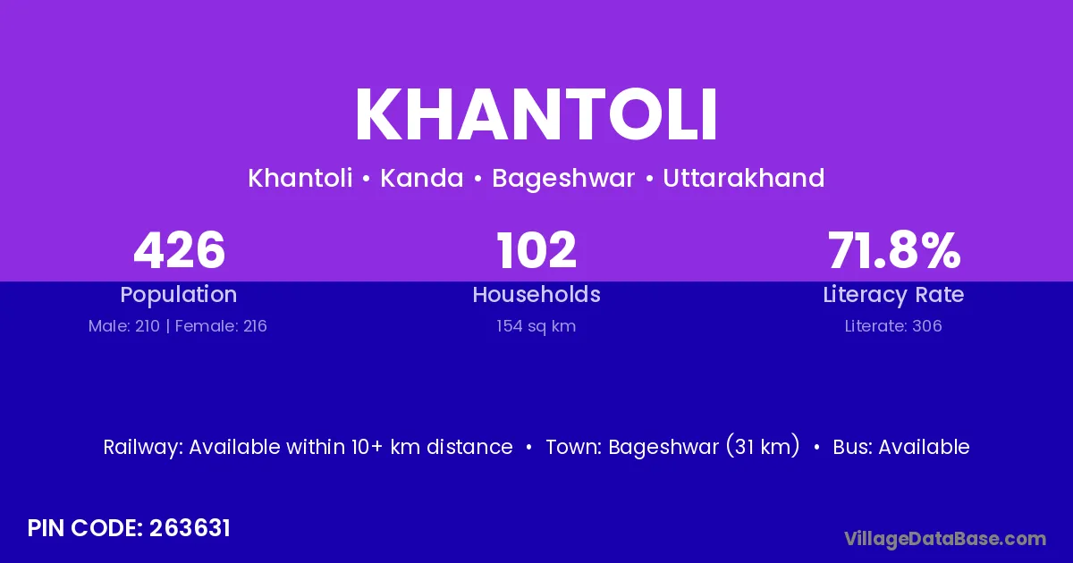 Bageshwar (31 km) is the nearest town to Khantoli village for major economic activities and is located approximately 31 km away.