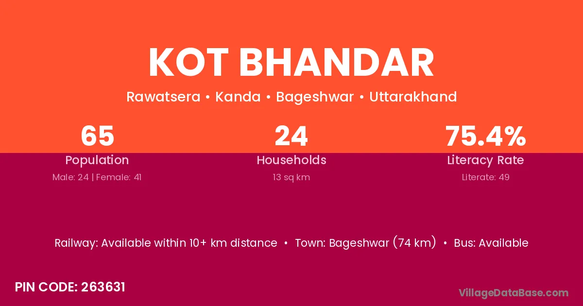 Bageshwar (74 km) is the nearest town to Kot Bhandar village for major economic activities and is located approximately 74 km away.