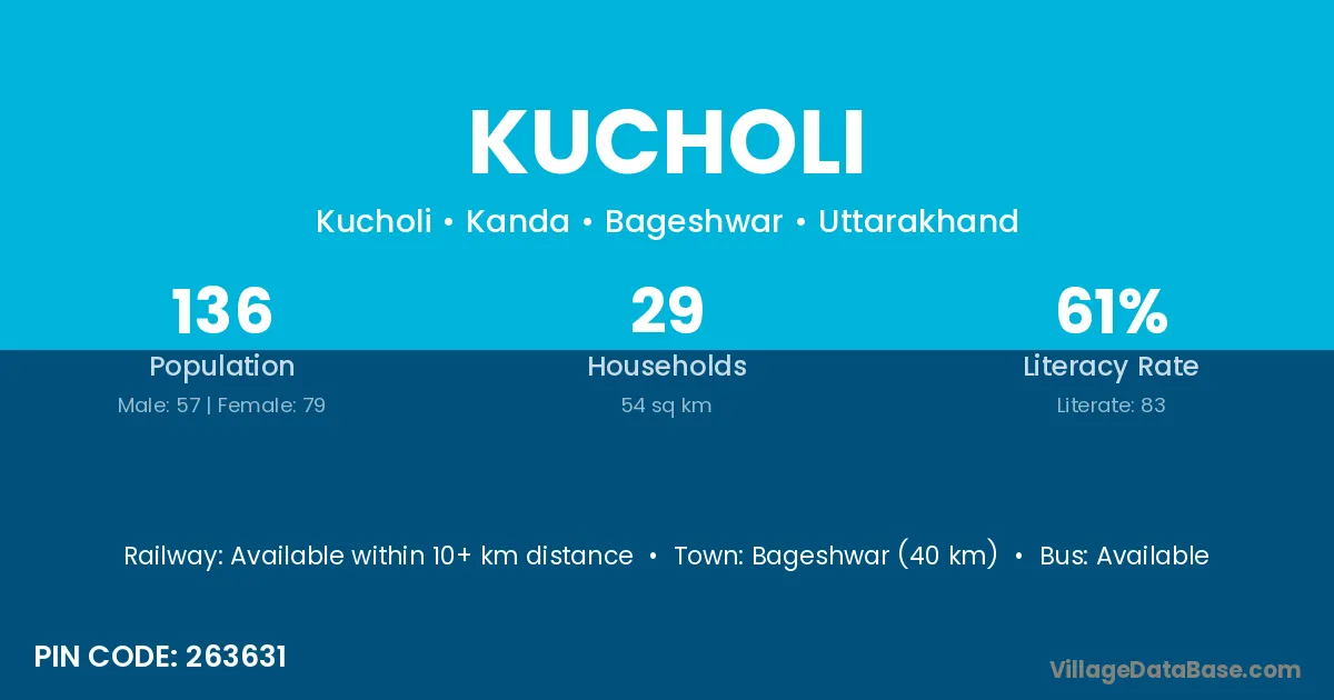 Bageshwar (40 km) is the nearest town to Kucholi village for major economic activities and is located approximately 40 km away.