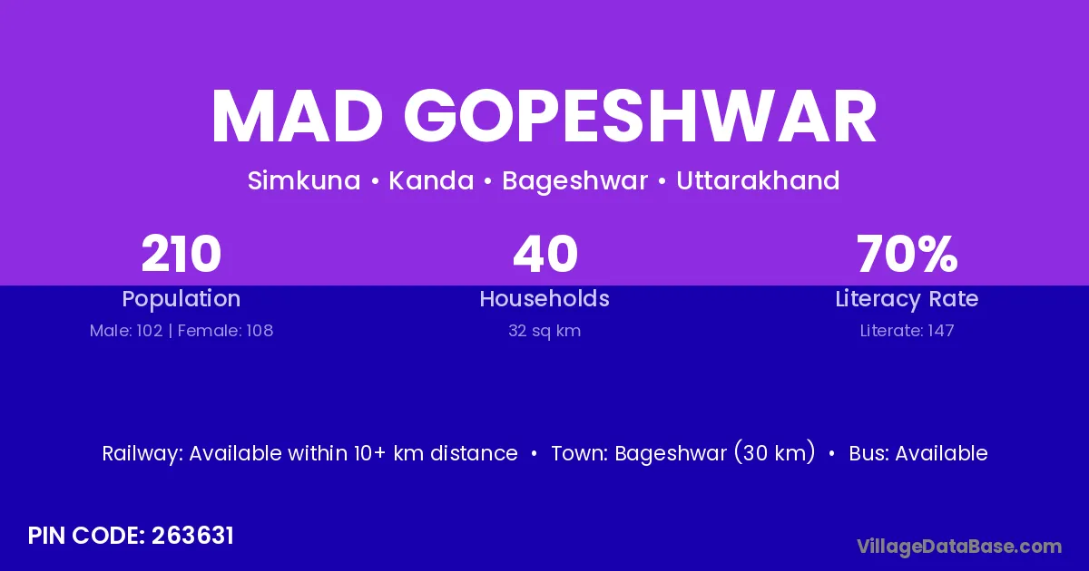 Bageshwar (30 km) is the nearest town to Mad Gopeshwar village for major economic activities and is located approximately 30 km away.