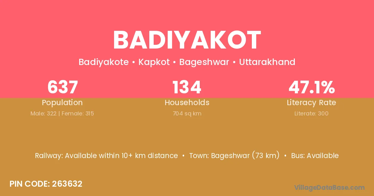 Badiyakot village has a total population of 637 people, of which 322 are males and 315 are females.