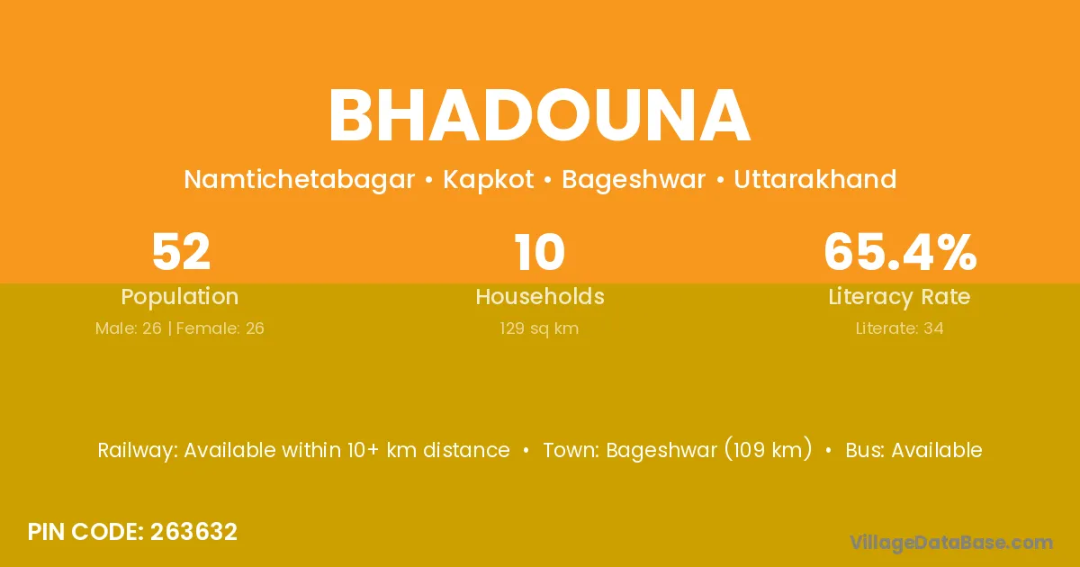 Bageshwar (109 km) is the nearest town to Bhadouna village for major economic activities and is located approximately 109 km away.