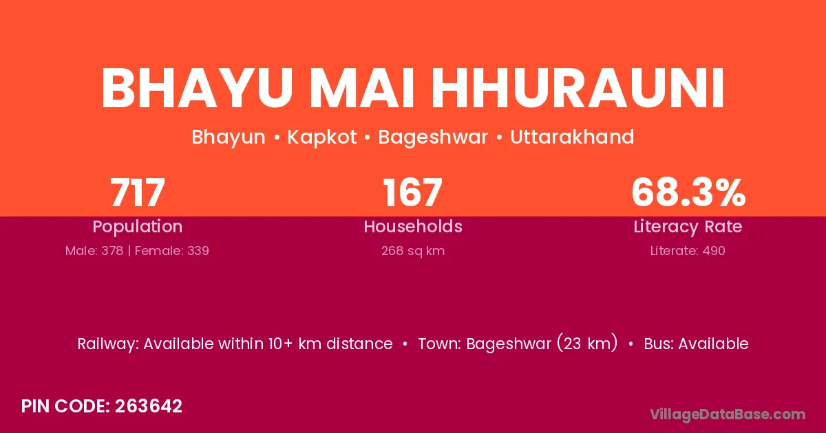 Bageshwar (23 km) is the nearest town to Bhayu Mai Hhurauni village for major economic activities and is located approximately 23 km away.