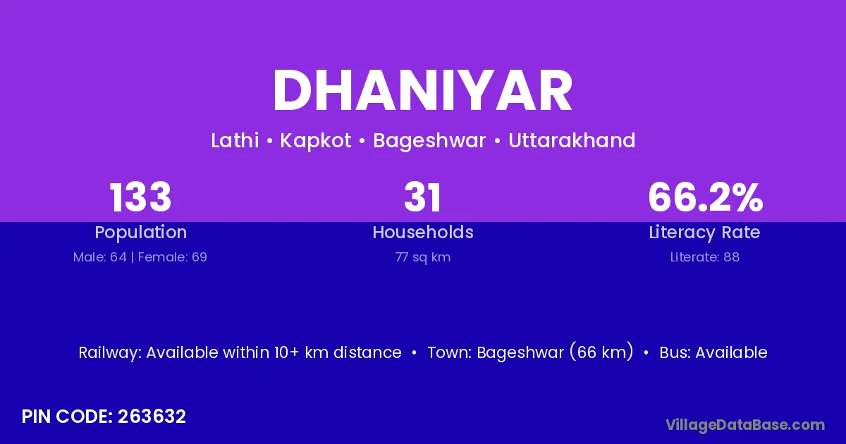 Bageshwar (66 km) is the nearest town to Dhaniyar village for major economic activities and is located approximately 66 km away.