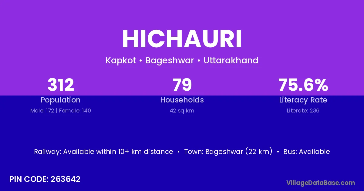 Bageshwar (22 km) is the nearest town to Hichauri village for major economic activities and is located approximately 22 km away.