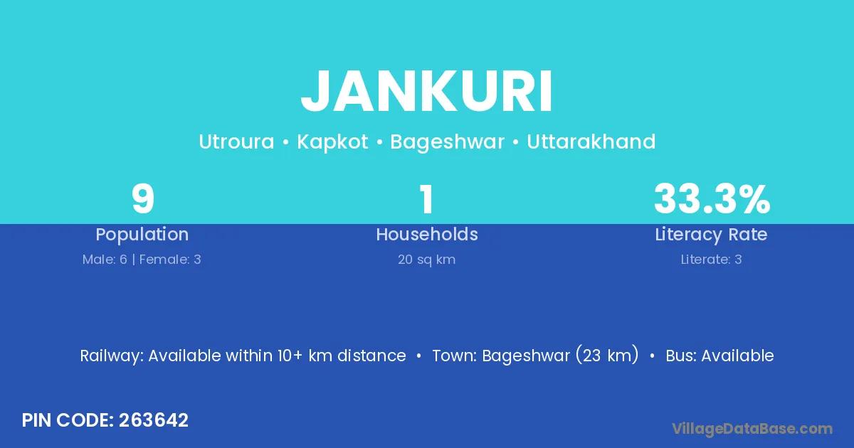 Bageshwar (23 km) is the nearest town to Jankuri village for major economic activities and is located approximately 23 km away.